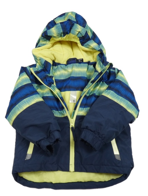 Tmavomodro-žluto-modrá šusťáková lyžařská bunda se vzorem a kapucí Lupilu