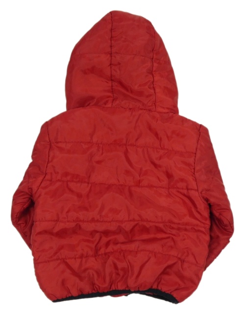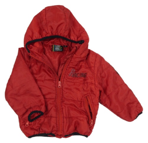 Červená šusťáková prošívaná zateplená bunda s nápisem a kapucí