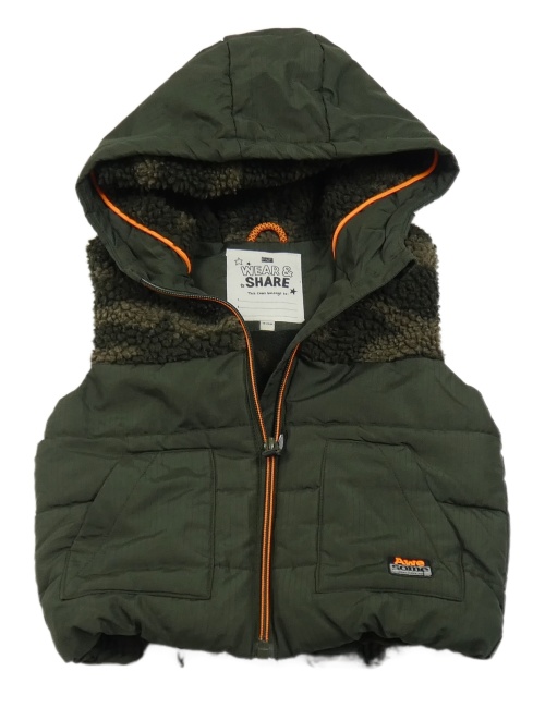 Tmavokhaki-army kostkovaná šusťákovo/huňatá zateplená vesta s nášivkou a kapucí F&F