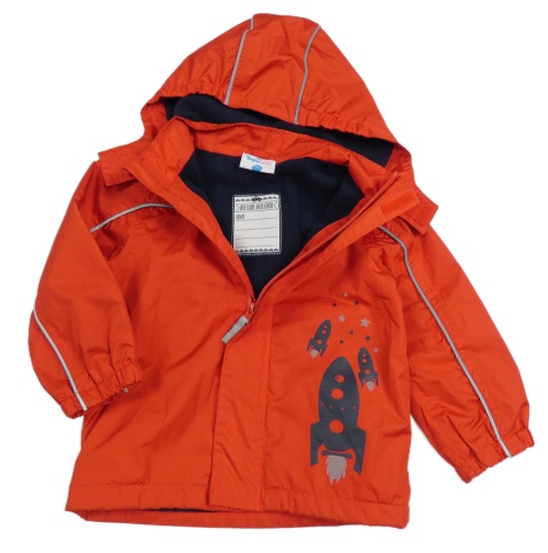Červená šusťáková zateplená bunda s raketami a kapucí Topomini