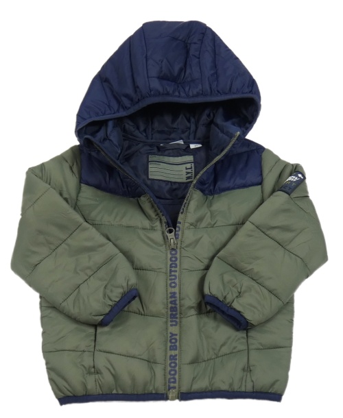Tmavomodro-khaki šusťáková prošívaná zateplená bunda s nápisem a kapucí Impidimpi