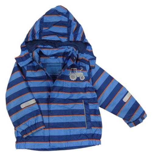 Tmavomodro-oranžová pruhovaná šusťáková podzimní bunda s traktorem a kapucí Pocopiano