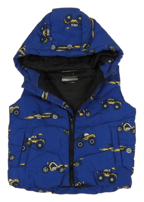 Tmavomodrá šusťáková zateplená vesta s monster trucky a kapucí Primark