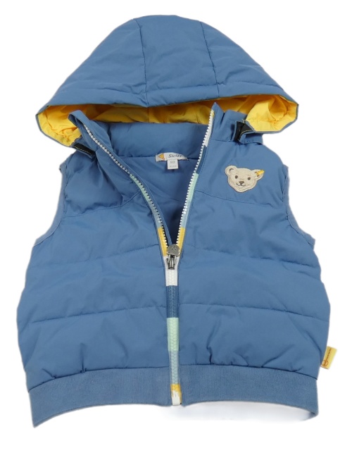 Modrá šusťáková zateplená vesta s medvídkem a kapucí