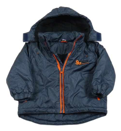 Tmavomodro-černá kostkovaná šusťáková zimní bunda s nápisem a kapucí
