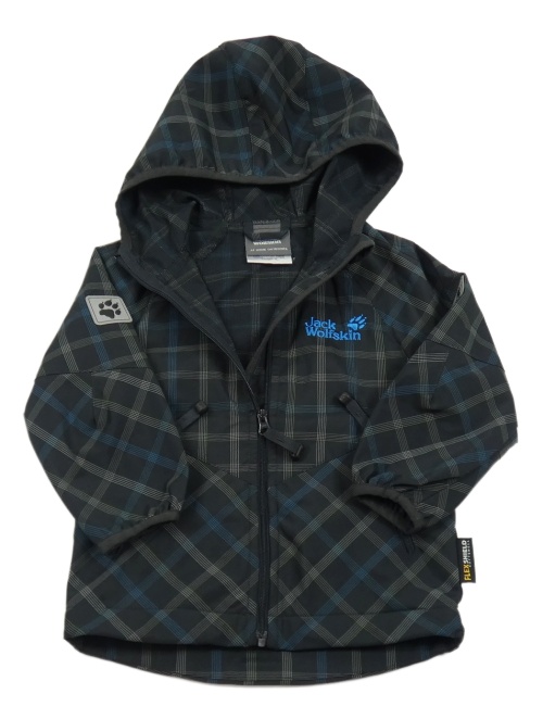 Tmavošedo-modrá vzorovaná šusťáková podzimní bunda s logem a kapucí Jack Wolfskin