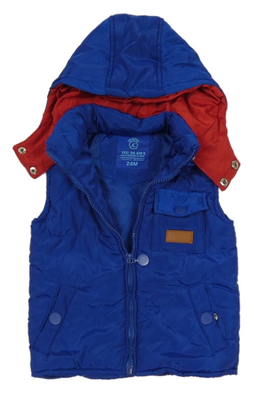 Kobaltově modro-červená šusťáková prošívaná zateplená vesta s odepínací kapucí