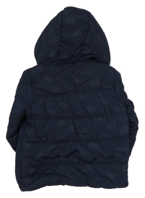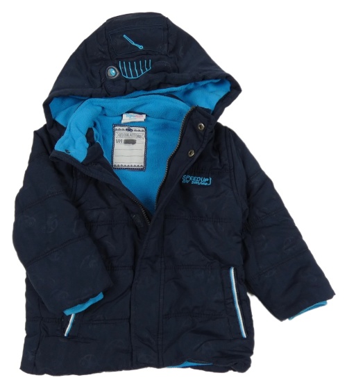 Tmavomodrá prošívaná šusťáková zimní bunda s auty a kapucí Topomini