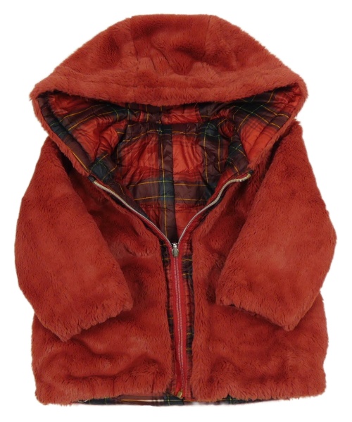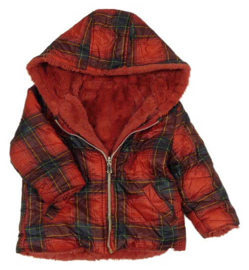 Červeno-černo-modrá kostkovaná šusťáková zimní oboustranná bunda s kapucí