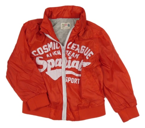 Červená šusťáková podzimní bunda s nápisem a ukrývací kapucí