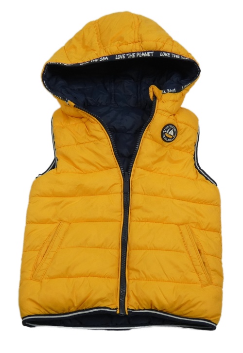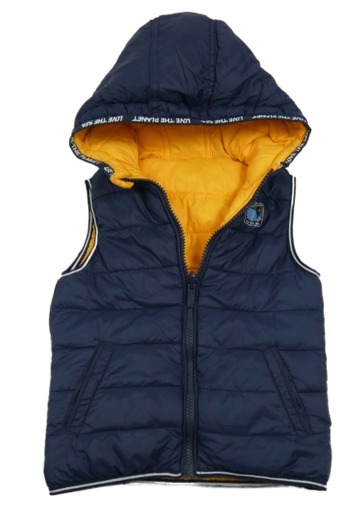 Tmavomodrá šusťáková zateplená oboustranná vesta s potiskem a kapucí C&A