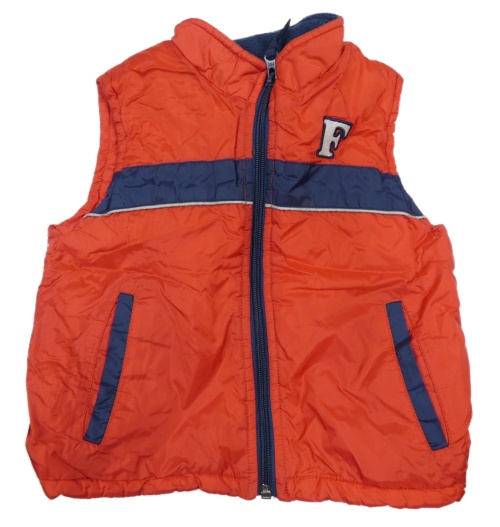 Červeno-tmavomodrá šusťáková zateplená vesta s písmenem