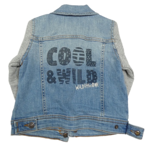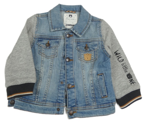 Světlemodrá riflová bunda se šelmou a šedými teplákovými rukávy a nápisy C&A