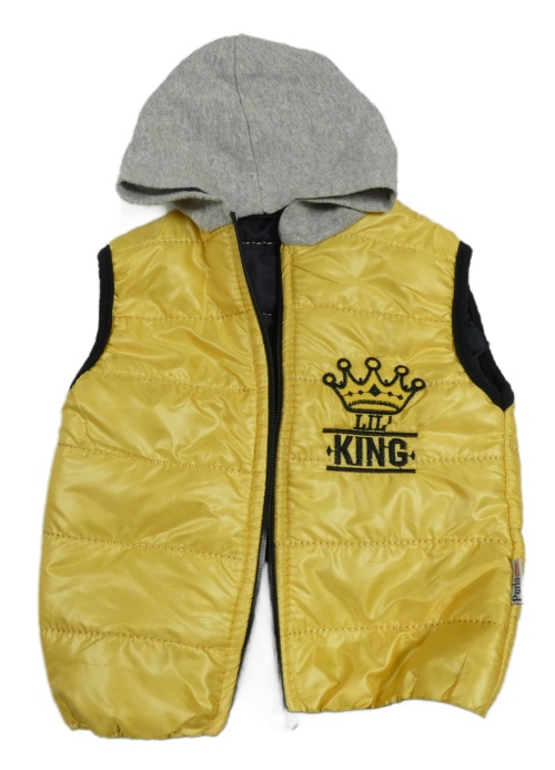 Žlutá šusťáková zateplená vesta s korunkou kapucí