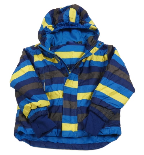 Tmavomodro-modro-žlutá pruhovaná šusťáková zimní bunda s kapucí Lupilu