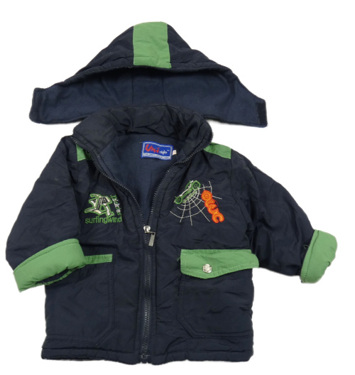 Tmavomodro-zelená šusťáková zimní bunda s výšivkou a odepínací kapucí
