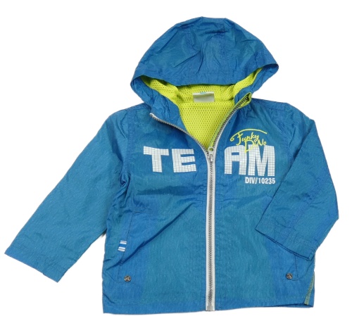 Modrzelená melírovaná šusťáková jarní bunda s nápisy a kapucí Topomini