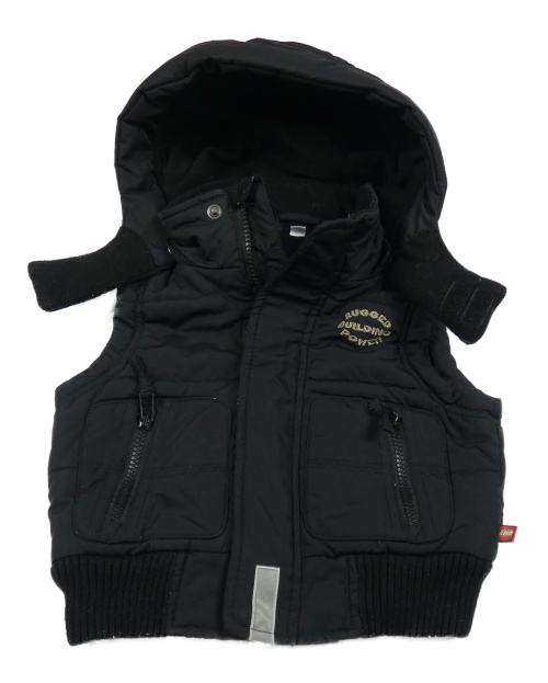 Černá prošívaná šusťáková zateplená vesta s nápisy a odepínací kapucí LEGO