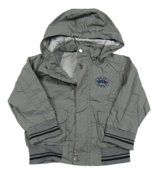 Šedý šusťákový jarní bomber s autem a pruhy a odepínací kapucí impidimpi