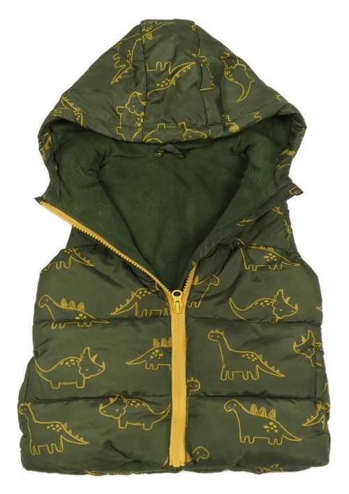 Khaki šusťáková zateplená vesta s dinosaury a kapucí Dunnes