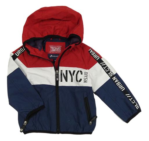 Červeno-bílo-tmavomodrá šusťáková jarní bunda s nápisem a kapucí C&A