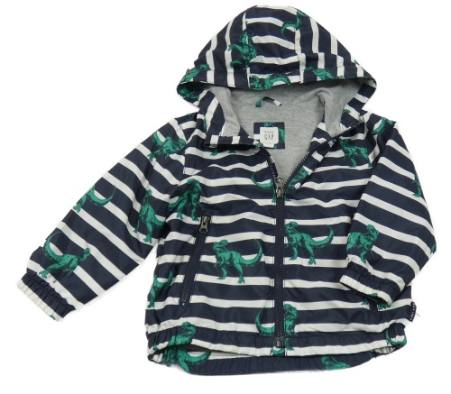 Tmavomodro-bílá pruhovaná šusťáková jarní bunda s dinosaury a kapucí GAP