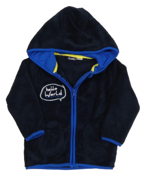Tmavomodrá plyšová bunda s nápisy a kapucí lupilu