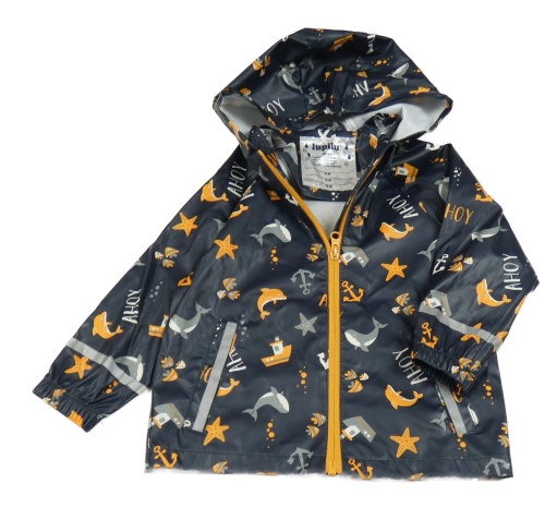 Tmavomodrá nepromokavá bunda s velrybami a rybkami a kapucí Lupilu