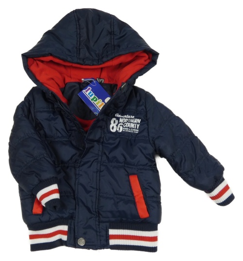 Nové - Tmavomodrá šusťáková zimní bunda s nápisem a kapucí Lupilu
