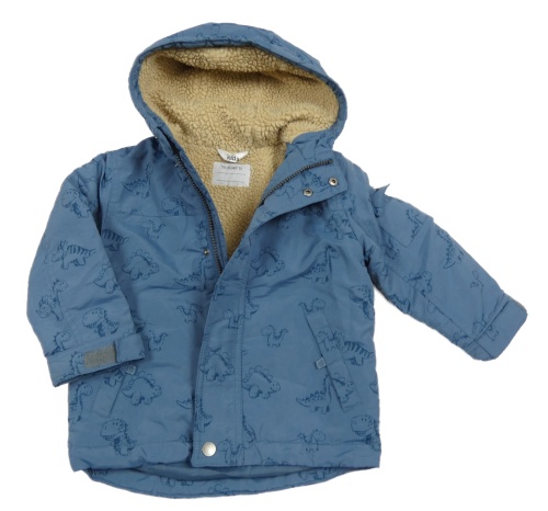 Modrá šusťáková zateplená bunda s dinosaury a kapucí M&Co.
