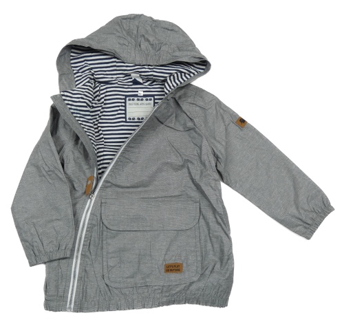 Šedá melírovaná plátěná jarní bunda s nášivkami a kapucí Topomini