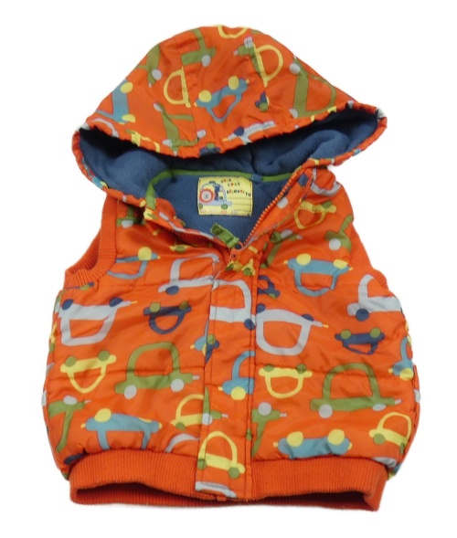 Tmavooranžová prošívaná šusťáková zateplená vesta s auty a kapucí Tu