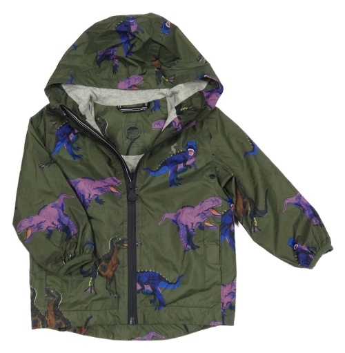 Khaki šusťáková jarní bunda s dinosaury a kapucí Joules