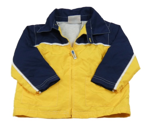 Hořčicovo-tmavomodrá šusťáková jarní bunda