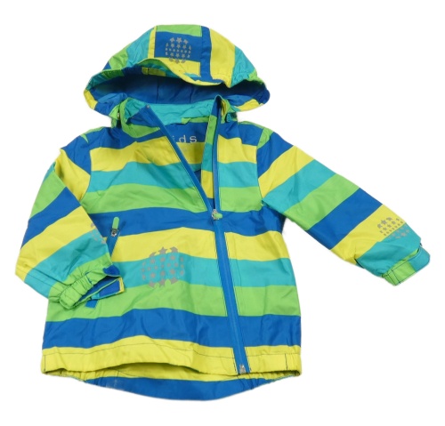 Zeleno-modro-žlutá pruhovaná šusťáková jarní bunda s kapucí Tchibo