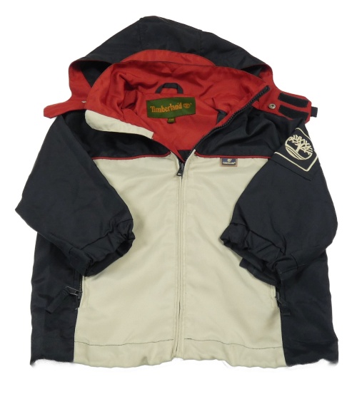 Béžovo-tmavmodro-červená šusťáková jarní bunda s odepínací kapucí