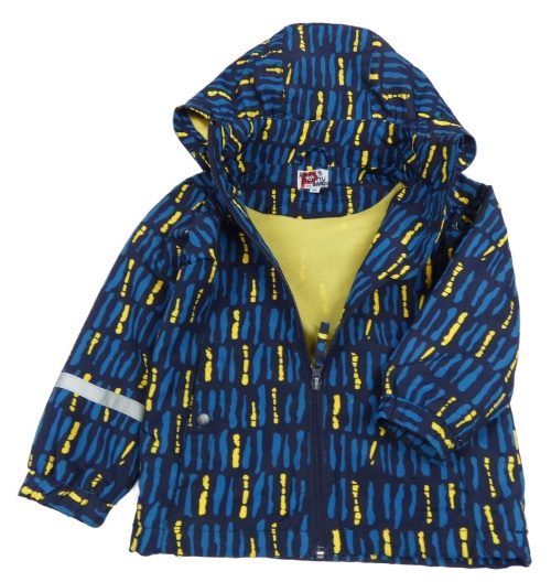 Tmavomodro-modro-žlutá vzorovaná šusťáková jarní bunda s odepínací kapucí