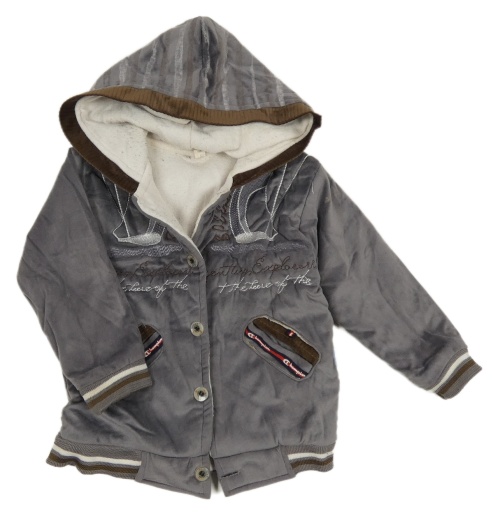 Šedá sametová zateplená bunda s nápisy a kapucí