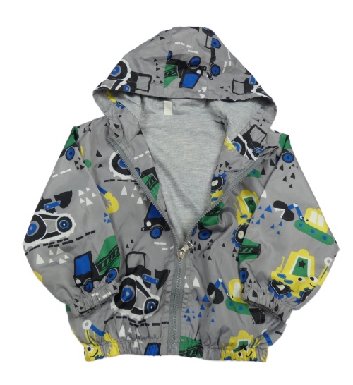 Šedá šusťáková jarní bunda s traktory a kapucí