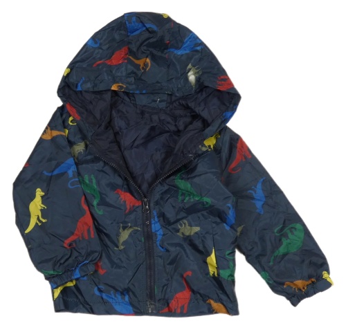 Tmavomodrá šusťáková jarní bunda s dinosaury a kapucí