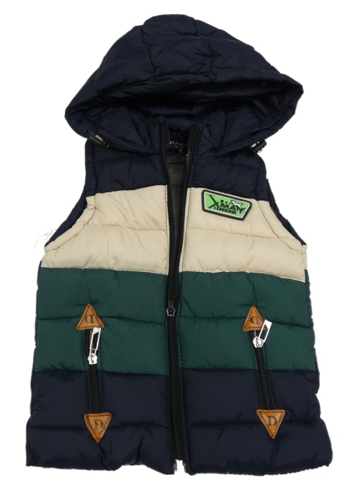 Tmavomodro-smetanovo-zelená šusťáková zateplená vesta s nášivkou a kapucí