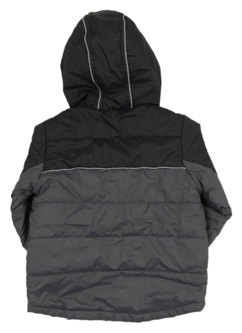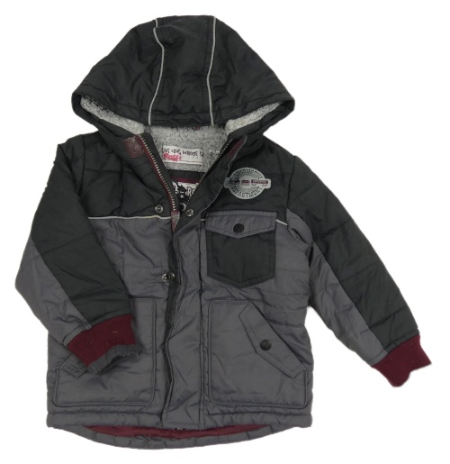 Tmavošedo-černá vzorovaná šusťáková zimní bunda s nášivkou a kapucí