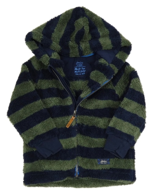 Khaki-tmavomodrá pruhovaná huňatá bunda s kapucí joules