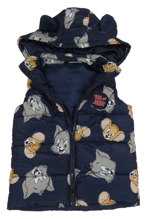 Tmavomodrá šusťáková zateplená vesta s Tomem s Jerrym a kapucí