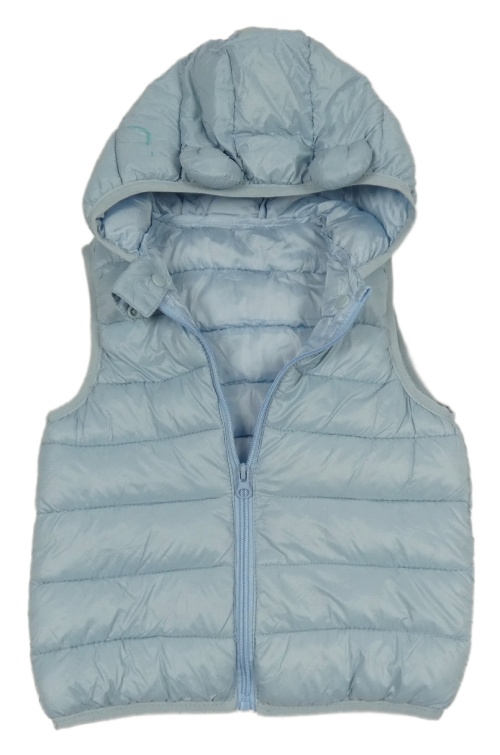 Světlemodrá šusťáková prošívaná zateplená vesta s kapucí