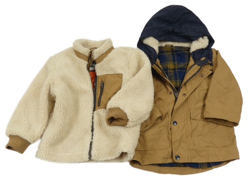 2set - Hnědo-tmavomodrá šusťáková jarní bunda se zateplenou kapucí + smetanová huňatá propínací mikina George