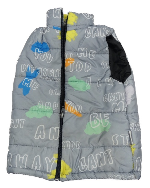 Šedá šusťáková zateplená vesta s nápisy a vzorem