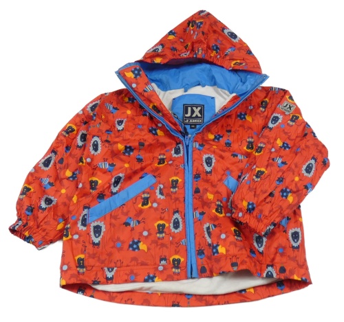 Červená šusťáková jarní bunda se zvířátky a kapucí
