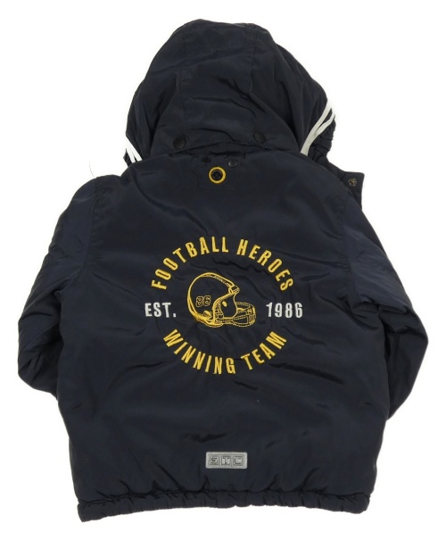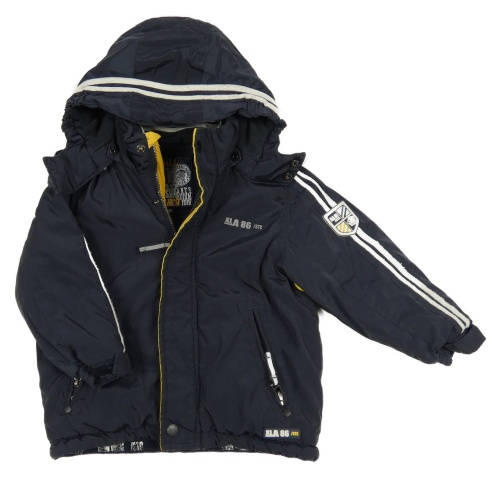 Tmavomodrá šusťáková přechodová bunda s nášivkou a pruhy a helmou a odepínací kapucí STACCATO