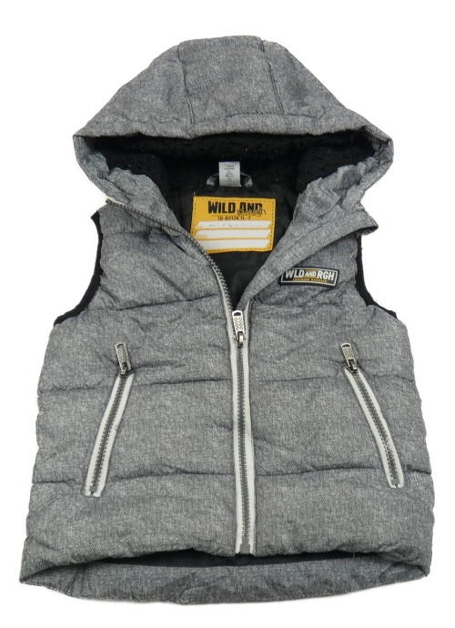 Šedá melírovaná šusťáková zateplená vesta s nápisem a kapucí Dopodopo